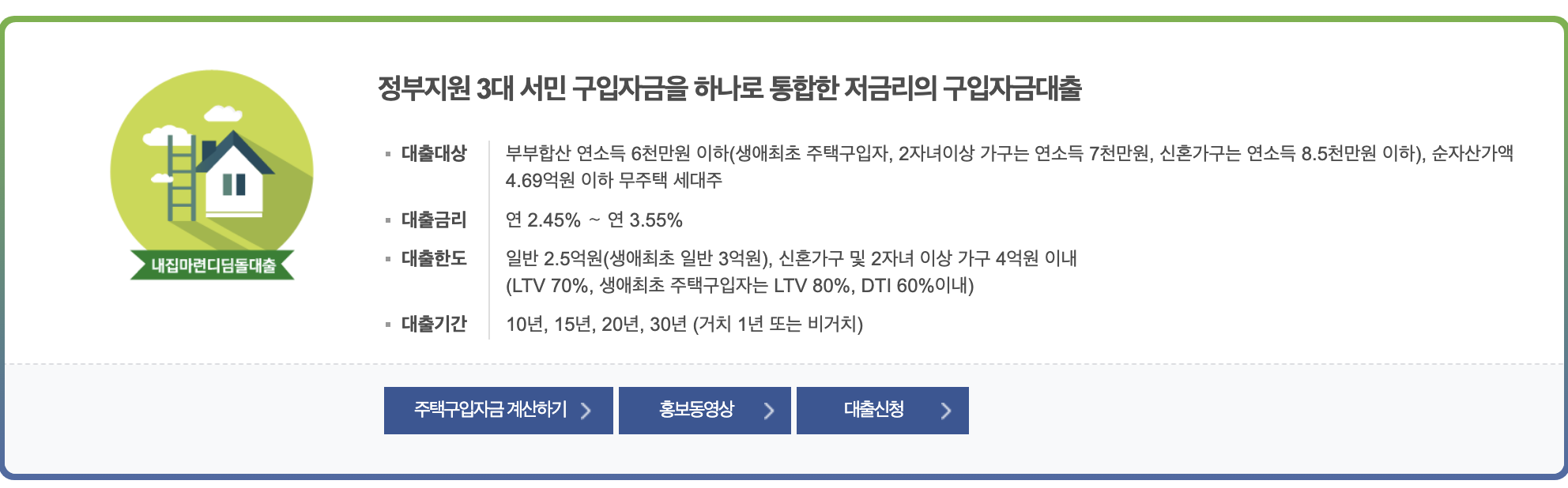 디딤돌 대출은 무주택 세대주를 대상으로 하는 정부지원 주택담보대출 상품입니다. 저렴한 금리로 주택 구매를 지원하여, 주거 안정을 도모하고자 설계되었습니다.