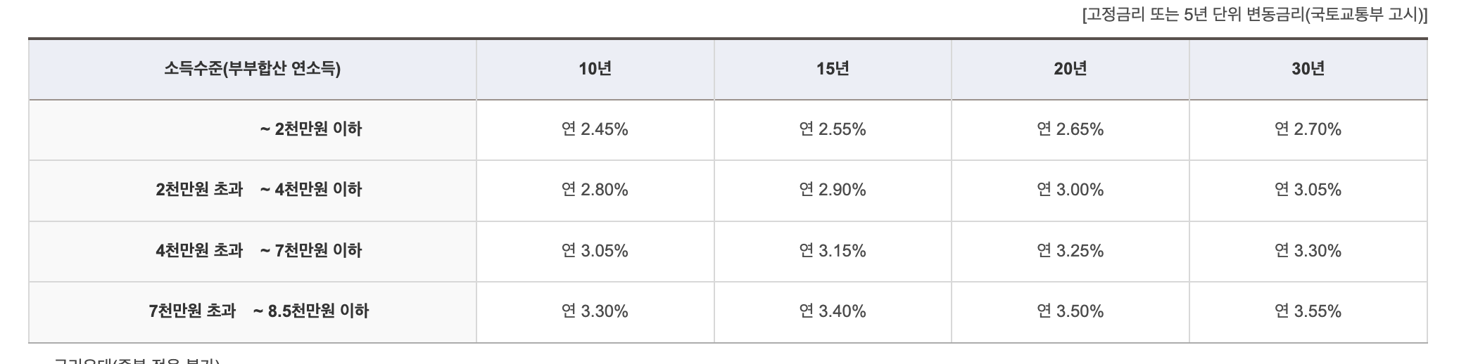 금리는 연소득 및 대출 기간에 따라 다르게 책정됩니다. 가장 낮은 금리는 2.45%부터 시작하며, 소득수준이 높아질수록 금리도 상승합니다.
