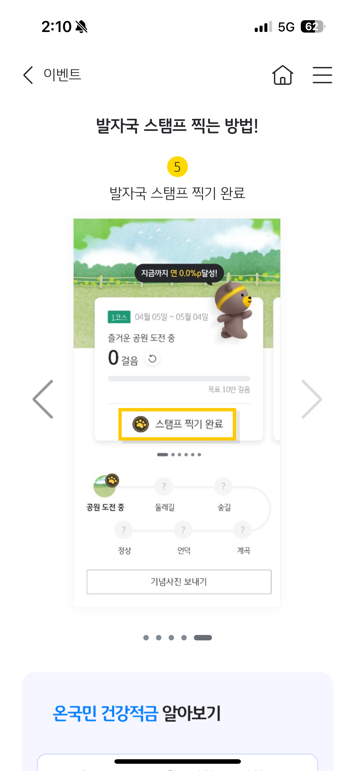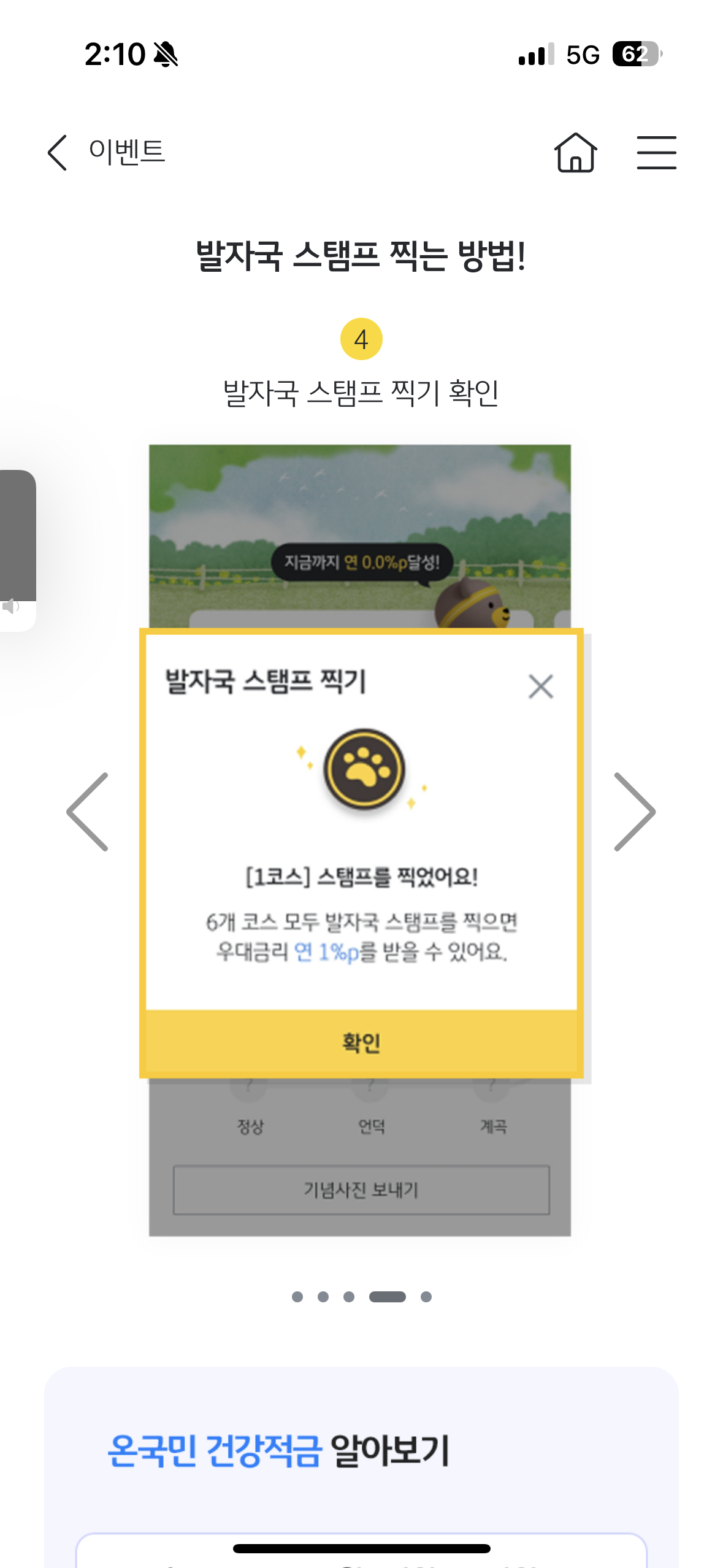 - 이벤트 기간 중 10만 걸음을 달성하면 추첨 확률이 2배로 증가합니다. 10만 걸음 달성 후 이벤트 기간 내 [금리확인] 화면에서 걸음 수 확인이 필수이며, 미조회 시 걸음 수 연동이 되지 않아 추첨 확률 2배 적용이 되지 않습니다.