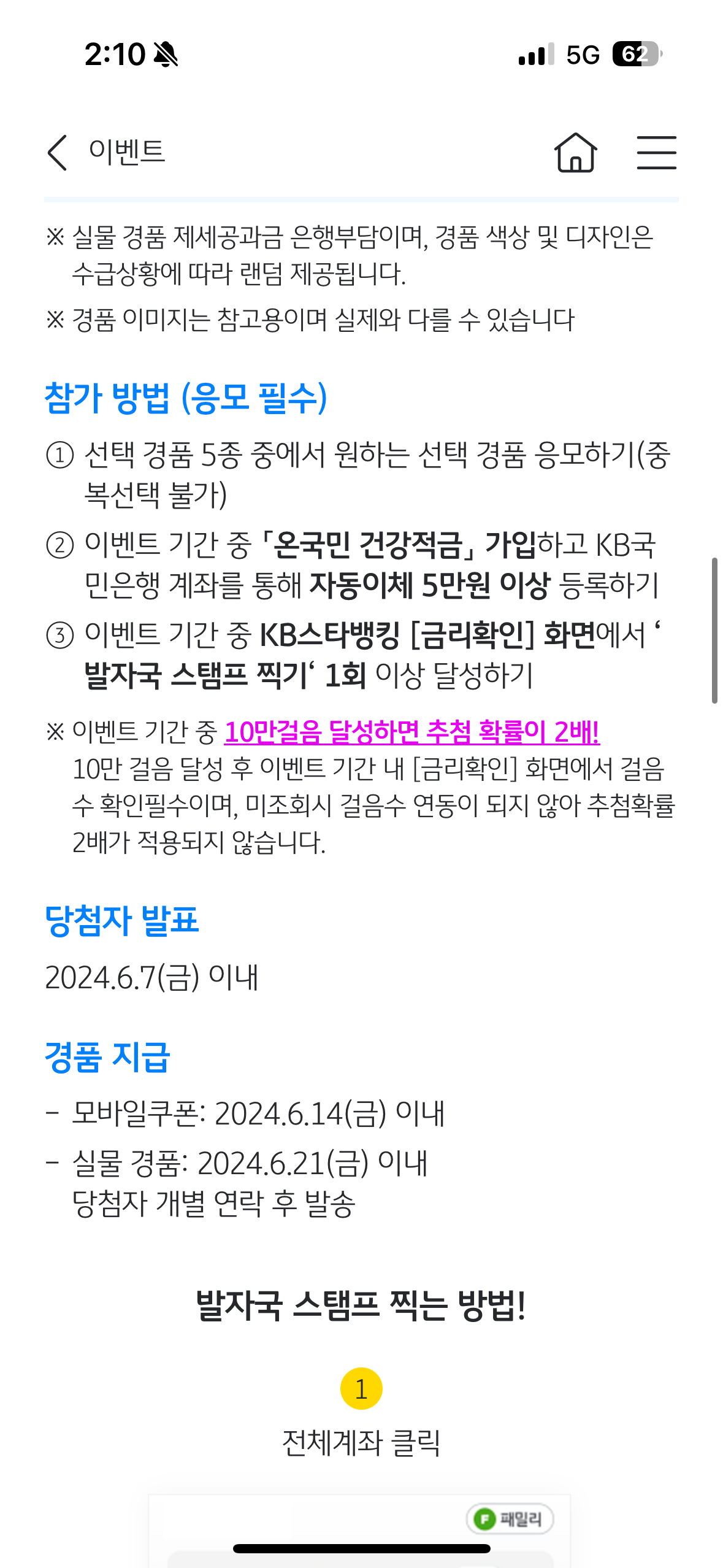 - 2024년 6월 7일 기준 온국민 건강적금을 해지했거나 자동이체 5만원 이상 미등록한 고객, KB스타뱅킹 탈퇴 고객은 경품 지급 대상에서 제외됩니다.