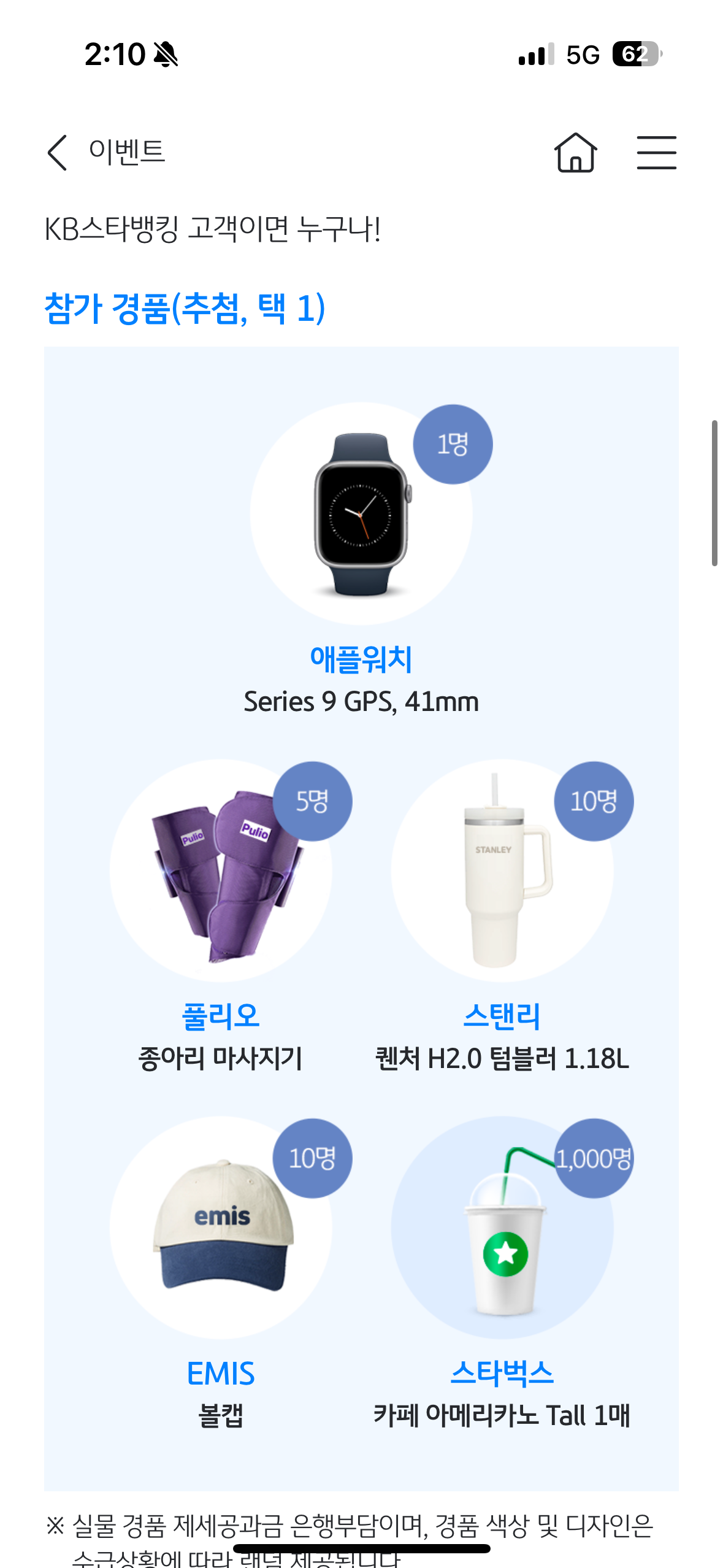 - 경품 수령을 위해 KB국민은행 고객정보상의 휴대전화번호를 확인해주세요. 연락처 불일치 시 수령이 불가할 수 있습니다.